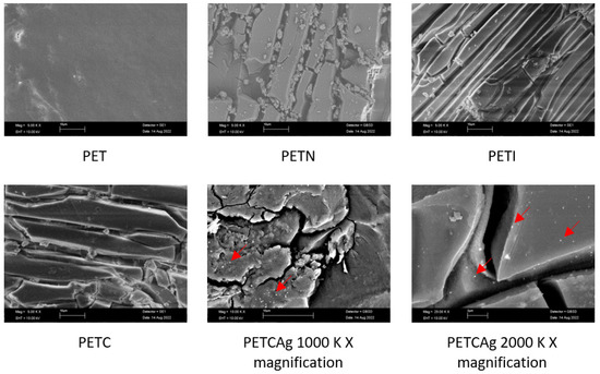 SEM images of PET films at different stages of the grafting process of chitosan polymer chains and with silver nanoparticles (marked with red arrows).