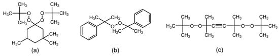 Chemical structure of organic peroxides used as cross-linking agents: (a) T29, (b) DCP, and (c) T145.