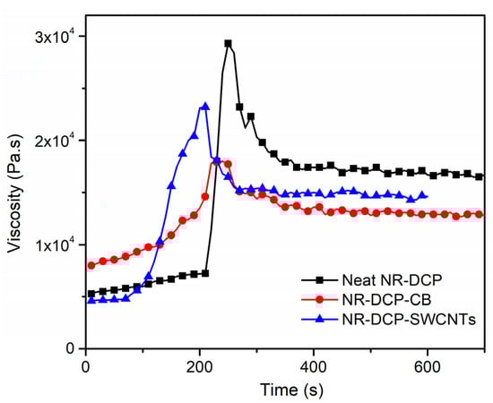 To analyze the influence of the organic peroxides and fillers such SWCNTs and CB on the vulcanization of the NR composites, curing curves for each NR formulation were obtained. In order to illustrate this effect, the viscosity vs. time curves obtained for NR-SWCNTs composites using DCP at 160 °C are depicted in Figure 2. As observed, three zones can be distinguished in a typical vulcanization curve. The first one, at low viscosity values, is defined as an induction zone where the free radicals are forming, and the earlier reactions take place. The second zone corresponds to the curing stage, which is characterized by an increase in the viscosity of the elastomer; during this time, most of the cross-linking reactions occur. The vulcanization time (t.v.) is the time at which the highest viscosity value is reached on the vulcanization curve. The third zone is defined as an over-curing or maturation stage due to an excess of free radicals; in this region, a decrease in viscosity can be observed since the applied torque, which can lead to a certain degree of degradation of the NR. As shown, the curing curve of neat NR-DCP composite exhibits a relatively extended induction zone maintaining viscosity values almost constant by around 200 s; after, it suddenly reaches its highest viscosity value at 252 s. On the other hand, when SWCNTs are added to the formulation, a significant decrease in induction time is observed, producing that the curing peak of NR occurs at lower vulcanization time and at lower viscosity values compared to the NR composites without fillers. As for the NR-DCP-CB composite, the vulcanization curve shows a much more gradual tendency toward the maximum point of curing, which is recorded at a higher t.v. value than the NR-DCP-SWCNTs composite and at a lower viscosity value compared to the neat NR-DCP and NR-DCP-SWCNT composites.