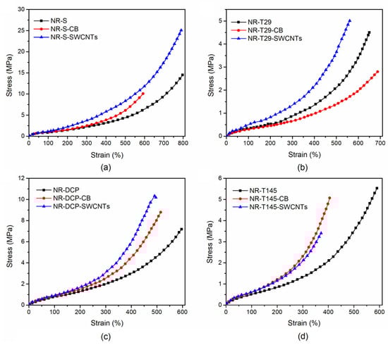 Stress–strain curves of the NR composites vulcanized with different cross-linking agents: (a) sulfur, (b) T29, (c) DCP, (d) T145 and incorporating CB or SWCNTs as fillers.