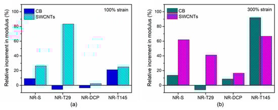 Relative increments in modulus at (a) 100 and (b) 300% strain for the NR composites vulcanized with different cross-linking agents and incorporating CB or SWCNTs as fillers.