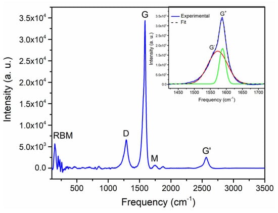 Raman spectroscopy has been used as an efficient method to study the effect of SWCNTs on NR in composites [,]. Figure 7 shows the Raman spectrum of the pristine SWCNTs employed as filler in the NR composites. As observed, the characteristic absorption bands of SWCNTs comprise the radial breathing mode (RBM) at low frequencies in the range 100–250 cm−1, the tangential G-band at 1585 cm−1, and several weak features such as the D-band at 1310 cm−1 related to defects in the nanotube structure [,] and the M-band near 1750 cm−1 (an overtone of the out-of-plane infrared-active mode in graphite) []. The presence of such absorption bands matches the semiconductor nature of SWCNTs. Additional evidence of the semiconductor nature of the SWCNTs employed in the present work is the distortion of the line shape of the G-band (inset in Figure 7) attributed to the and features. The first feature () is associated with carbon atom vibrations along the nanotube axis (longitudinal optic phonon mode, which appears at 1585 cm−1) and the second feature (at 1556 cm−1), which is sensitive to charge transfer from dopant additions to SWCNTs [,]. The G’-band is considered a second-order feature and gives information about the electronic structure of the semiconductor or metallic nature of SWCNTs.