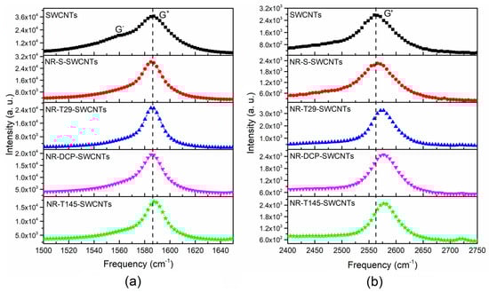 Figure 8 displays the G- and G’-band Raman spectra of the NR-SWCNTs composites formulated with different cross-linking agents compared with the Raman spectrum of the pristine SWCNTs. As shown in Figure 8a, the intensity of the G-band for pristine SWCNTs monotonically decreases when reacting with the different cross-linking promoters; such tendency seems to be more evident in the NR-SWCNTs composites vulcanized with organic peroxides. Another important observation is that the feature of SWCNTs completely disappears once the vulcanization process with each cross-linker occurs, which can reflect the hardening of the C–C bonds as the electronic density decreases [], probably due to the reaction between the free radicals formed during the vulcanization process with organic peroxides and the wall surface of the SWCNTs. Additional data to support such assertions can be obtained by analyzing the D-band (Figure 7); the absorption at 1310 cm−1 corresponds to disordered graphite structures. The D-band is activated through the first-order excitation process of sp2 carbons by the presence of in-plane-substituted heteroatoms, vacancies, and grain boundaries, and provides unique information on the chirality and diameter dependence []. This second-order feature can be used for materials characterization to probe and monitor structural modifications of the nanotube sidewalls that come from the introduction of defects and the attachment of different chemical species. It has been accepted that the sample purity or the modification degree of the nanotube sidewall can be obtained by calculating the D/G band intensity ratio (ID/IG) from the Raman spectra of SWCNT composites []; thus, the intensity ratios of the NR-SWCNTs composites with different vulcanization agents were calculated and listed in Table 7. For the vulcanized composites, increments in the ID/IG ratio due to increases in the D-band intensity are obtained. This result indicates a sidewall modification in the SWCNTs due to the reaction with the free radicals generated during the vulcanization process; such an interaction introduces defects and probably attaches reactive chemical species to the nanotube walls.