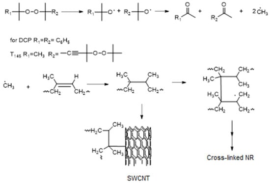 It is interesting to consider that the type of bonds formed during the cross-linking process depends on the curing agents. In the case of sulfur, mono- (C-S-C), di- (C-S2-C), and polysulfidic (C-Sx-C) bonds can be formed [,,]. It is well known that the longer the bond that links the rubber molecules, then higher will be the mobility between polymeric chains, and thus, the final rubber compound will be more flexible. In contrast, organic peroxides generate exclusively C-C bonds less flexible than C-Sx-C chemical bonds. As a result, one expects that the tensile failure strain will be higher in materials with C-Sx-C bonds and lower in materials vulcanized with exclusive C-C bonds. This can explain the lower values of tensile strength obtained in the NR composites vulcanized with organic peroxides. Furthermore, it is well accepted that the interactions between nanotubes and rubber molecules occur through entanglements and classical nonbonded interactions []; however, the reduction observed in the vulcanization time of the NR-SWCNTs composites in conjunction with the increments in moduli, tensile strength, and reduction in the strain at breakage (Table 5) lead us to suppose that an interaction between the NR and the SWCNTs certainly occurred. A key condition for such an interaction to occur is an efficient dispersion of SWCNTs in the rubber matrix, which was accomplished by the previous SWCNTs dispersion in the masterbatch and the subsequent milling process with the components of the formulation. In that sense, we suggest a grafting reaction between the rubber macroradicals generated during the vulcanization process with the surface of SWCNTs. The free radicals generated at the NR segments may interact with the walls of the nanotube resulting in a reduction in the mobility of the NR chains, thus producing a more rigid polymer network. Scheme 1 shows a possible vulcanization reaction mechanism of NR using the studied organic peroxides, including the possible reaction between the free radicals generated due to the thermal decomposition of the organic peroxide with the SWCNT surface.