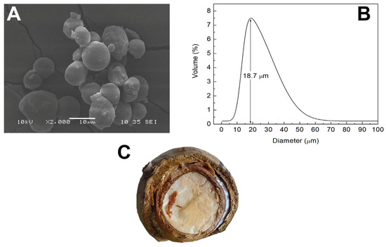 Scanning electron microscopy (SEM) analysis of starch isolated from colok fruit seeds is shown in Figure 2A. Starch granules’ functional properties are significantly influenced by their granule size and size distribution. Through this analysis, shape of the granules of this non-conventional native starch was identified. The shape of these granules is spherical, uniform and without fractures. Therefore, it indicates that the alkaline extraction of this macromolecule does not affect the integrity of the granules, nor modify their shape, although morphological traits can vary depending on the cultivar, plant growth, environmental circumstances, and techniques of extraction and purification; smooth surfaces without fractures suggest purity in starch extraction. Granule size distribution is shown in Figure 2B. Regarding its size, the average report is 18.7 μm; hence, agreeing to the classification appointed by Lindeboom et al. [38], and according to their size, these granules are classified as medium (between 10 and 25 μm). However, these particles are larger than those related to native corn starch, whose granules measure 15 μm [39]. Starch granule size plays an essential role that influences pasting parameters of starches. Applications that call for relatively small starch granules, such paper coating, can use starch with small starch granules.