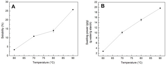 The swelling power and solubility represent evidence of interaction between the amorphous and crystalline areas. In addition, it is influenced by amylose and amylopectin characteristics [45]. Specifically, the SP of starch gives information on the mass of water that can be absorbed by one gram of starch granules in the presence of excess water at high temperature. Coincidentally, SP value also indicates the degree of crystallinity of the starch granules. Starch granules with lower crystallinity have a higher tendency to absorb more water and swell to a larger extent. Commonly, tuber starches have lower crystallinity and hence exhibit high SP due to their higher amylopectin content. Starch granules with greater SP usually show a harmonious higher amylose leaching [46]. Figure 3B shows the result of the swelling power analysis as a function of temperature. In this Figure, an increment in the swelling power as the temperature increased at a constant change rate was observed. This behavior may be due to the fact that, at high temperatures, there is a progressive relaxation of the binding forces within the granule, which implies an increase in SP while augmenting temperature. Likewise, it is observed that at 60 °C the swelling power of the starch was minimal; however, as the temperature increased to 90 °C, the SP increased to a maximum of 19.6 g water/g starch, which represents an 85% increase from 60 to 90 °C. This behavior was similar to that reported for other starches [47]. Solubility of starch is the result of the leaching of amylose when the starch is heated under an excess amount of water. As the starch granules imbibe more water and swell, the amylose dissociates from and diffuses out of them. Figure 3A shows the result of the solubility analysis performed on colok starch. As can be noticed, there is an increase in IS at a constant change rate in the temperature range from 60 to 70 °C. Likewise, a decrease in IS was observed at a lower rate of change in the temperature range of 70 to 80 °C. Finally, a new increase in IS was observed at a higher change rate. Moreover, at 60 °C, IS is low and increases by 87% when going from 60 to 90 °C. According to Mbougueng et al. [48], the higher water absorption capacity could be due to the size of the starch granule. In addition, Betancur et al. [49] mention that the increase in this water absorption capacity would be due to the presence of hydrophilic groups that retain water. Kaur et al. [50] found differences in swelling power for small (30.4–30.7 g water/g starch) and large (25.7–27.2 g water/g starch) granule fractions of starches from different potato cultivars harvested in India. Furthermore, Lin et al. [51] mention that the higher solubility of starch can be attributed to a higher solubilization of polymers from starch granules possessing weaker rigidity, when heated at high temperature.