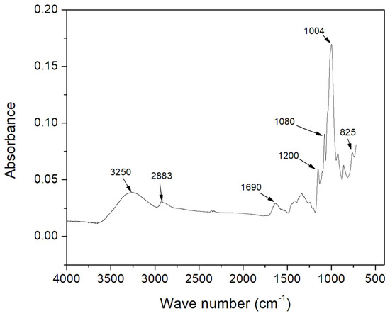 In order to obtain information about the functional groups in the isolated colok starch, Fourier Transform Infrared (FTIR) spectroscopy analysis was performed. In Figure 5, the infrared spectrum for starch obtained from colok seeds can be observed. In the spectrum, an absorption band around 3270 cm−1 is shown, which can be attributed to the vibration of the hydroxyl groups [25]. The broad nature of this band could indicate that the starch exhibits strong hydrogen bonding interaction among themselves, and the water molecules present in it [56]. Some band peaks can also be observed around 2920 cm−1, these peaks could be attributed to the stretching vibrations of the bonds belonging to C-H groups [57]. Likewise, the absorbance band appearing around 1630 cm−1 can be correlated to the bending of O-H bonds belonging to the presence of water absorbed by the starch [58]. In the same way, “fingerprint” area displays the characteristic peaks of the starch; in this region, the highest intensity peaks can be appreciated at 1150 cm−1, 1080 cm−1 and 1004 cm−1. These peaks could be attributed to the vibrations of glucose C–O–C bonds. Likewise, the bands exhibited around 926 cm−1, 860 cm−1 and 764 cm−1 could correspond to the pyranose ring [59]. In starches, an amorphous and a crystalline region coexists; the amount of each one of them is important in order to predict the response of this polysaccharide when it is processed, and to identify its behavior when it is stored [13]. In this sense, several authors [13,59,60] have reported the relationship between the bands around 1047 cm−1 referred to the ordered region and the band around 1022 cm−1 referred to the amorphous region. The relationship between these bands represents the order in the starches [59], in the case of the starch obtained from the seeds of colok (Talisia floresii Standl) is 1.7. Other authors have reported values similar to this, such as the one obtained from ramon (Brosimum alicastrum) seeds, which report a value of 1.6 [59]. This value is even higher than that obtained for huaya (Melicocus bijugatus) with a value of 0.9 [25].