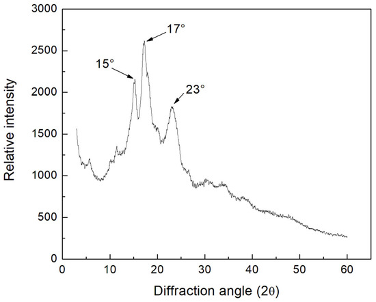 Figure 6 shows the results of the X-ray diffraction analysis. According to the water content and packing configuration of amylopectin, starch can present three main types of crystallinity, defined as A, B and C, distinguished by intensity X-ray diffraction lines [57]. Variations in the region between 6° < 2θ < 35° in X-ray diffraction patterns show that two different groups corresponding to type A and B starch structures are present [61]. Type A starches have two strong diffraction peaks around 2θ at about 15° and 23° and a doublet around 2θ at 17° and 18°, while type B starch possesses a strong diffraction peak around 2θ near 17°, as well as small peaks around 2θ near 15° and 24°. Diffractogram obtained for colok (Talisia floresii standl) starch is similar to that reported by other authors corresponding to ramon (Brosimum alicastrum) [59] and huaya (Melicoccus bijugatus) [25]. The percentage of crystallinity obtained for the starch analyzed in this work was 32 ± 1%. This value is similar to that reported by other authors, as is the case of ramon starch (Brosimum alicastrum) with 31.89% and 29.61% [59]. For the starch obtained from the same source, but using another isolation method, the value was found to be 30.56% [62] and for that obtained from huaya (Melicoccus bijugatus) around 31.22% [25].