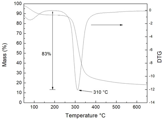 Thermal analysis results of colok starch are shown in Figure 7, where three stages can be identified. In the first of them, reduction of the mass at 100 °C is notable, a fact that is due to the loss of water [63]. This loss corresponds to 17% of the weight of the analyzed starch. In the second stage, which goes from 225 to 390 °C, the mass continues to decrease, which is related to starch molecules denaturation. Colok starch exhibits a decomposition temperature of 310 °C. At this stage, the mass of colok starch decreases by 83%. In the third stage, starting at 391 °C, the remaining mass is stabilized by the rearrangement of the carbon residues from the polymeric chains of amylose and amylopectin as observed by Tian et al. [64]. In addition, it could be seen that from 150 to 290 °C the starch is stable. This interval could process the starch by extrusion or injection, to convert it into some materials to use in food packaging; in fact, could incorporate some additives to make it more stable as any plasticizer or fill [65,66].