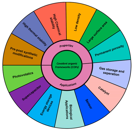 In addition to the dimension of COFs, they exhibit important features such as structural versatility, easy surface functionalization, pre- and post-synthetic modification, excellent chemical and thermal stabilities, a high surface area, permanent porosity, and low density [4]. The COF materials have significant advantages in a variety of applications thanks to their customized functions and well-defined crystalline porous architectures. Importantly, unlike MOFs, the majority of COFs have lower densities and, hence, exhibit good stability in chemical reagents, even under acidic, basic, oxidizing, and reducing conditions [3,4]. Additionally, COFs can also endure severe chemical and thermal conditions while maintaining their ordered structure and crystallinity. Commanding these features, COFs can be used for variety of applications which include energy and gas storage, optoelectronics, adsorption, drug delivery, Chemo sensors, and separation. Other intriguing applications include catalysis and sensing [5,6,7]. Figure 1 given below describes the properties and applications of COFs.