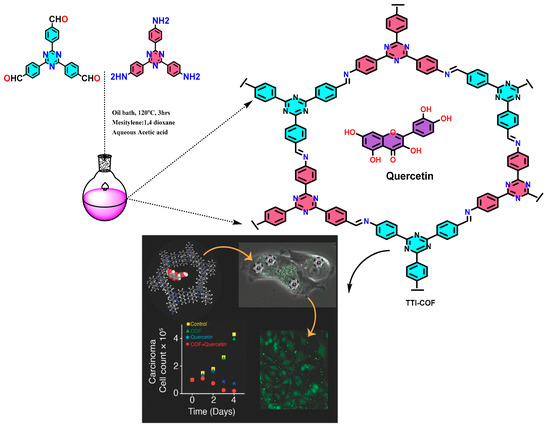 Graphical synthesis representation of imine-linked TTI-COF tagged with quercetin for cancer treatment [11].