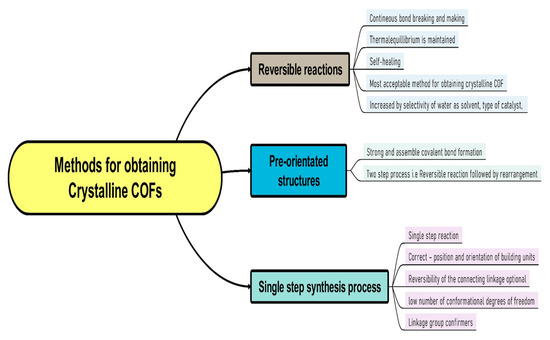 The reticular chemistry involves strong bonding to join molecular basic components to form crystalline open structures. It has greatly extended the range of chemical compounds and materials such as organometallic compounds (OMC), metal organic frameworks (MOFs), covalent organic frameworks (COFs), and so on. The linking processes in COFs and MOFs had to be developed to solve the “crystallization challenge”, resulting in crystalline products whose structure could be determined unequivocally using X-ray and electron diffraction analysis tools [13]. The crystallinity of COFs has shown how the outer surfaces of their frameworks may be functionalized to create locations for post-synthesis covalent reactions via chemical conjugation [13]. Reticulation of molecular building blocks into structures to produce COFs can circumvent quenching induced through aggregation. It is the most common emission quenching mechanism. For example, a very luminescent COF with organic polygons as vertices resulted in a new aggregation-induced emit [14]. This type of architectural modification results in crystalline porous COFs with regular layered columns patterns that dominate the COF’s luminance. Due to a topological interlocking effect of interlayer chemical bonds and interlayer non-covalent interactions, it has attained a phenomenal quantum yield [14]. In recent years, different approaches for creating regular materials by relying on reversible processes have sparked a great deal of attention [12,13,14]. Highly potent methods to regulate covalently linked substances produce superior crystallinity and sustainability in COFs while tolerating chemical functionalities with reversible reactions. The methods for obtaining crystalline COFs may be divided into three categories, i.e., (A) based on reversible reactions, (B) based on pre-orientation of construction materials, and (C) based on a single step synthesis route [12,13,14,15,16]. Figure 5 and Figure 6 represent flow diagrams including all three categories to enhance the crystallinity of COFs and the complete strategy to increase the crystallinity of the synthesized COFs.