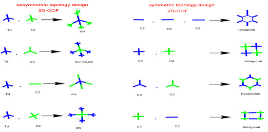 Co-condensation of ether two monomers or self-condensation of one monomer results in symmetric topology. Co-condensation joins two monomers as a knot and a connector to produce a polygon structure that is alternatively connected. A [C3 + C2] design, for instance, produces a hexagonal topology by combining C3- and C2-symmetric monomers, a [C4 + C2] design creates a new main topology tetragonal structure with C4 and C2 symmetric monomers, whereas rhombic topology is produced when C2 monomers undergo self-condensation to produce a [C2 + C2] design diagram [17]. The direct fabrication of microporous tetragonal skeletons is possible using a [C4 +C4] geometry diagrams, whereas the microporous hexagonal topology is framed by the self-combination of C3 monomeric units, resulting in a [C3 + C3] design.