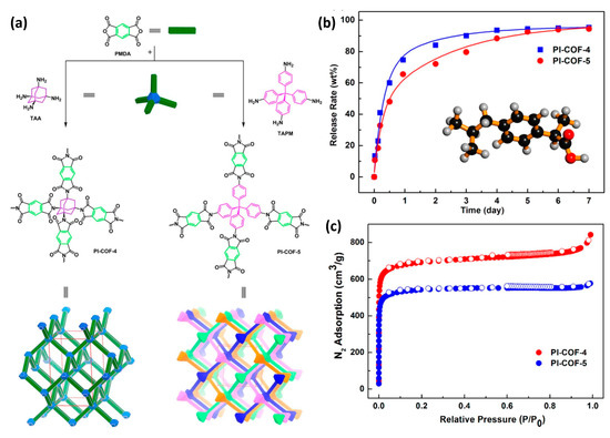 - Fang, Q.; Wang, J.; Gu, S.; Kaspar, R.B.; Zhuang, Z.; Zheng, J.; Guo, H.; Qiu, S.; Yan, Y. 3D porous crystalline polyimide covalent organic frameworks for drug delivery. J. Am. Chem. Soc. 2015, 137, 8352–8355. [Google Scholar] [CrossRef] [PubMed]