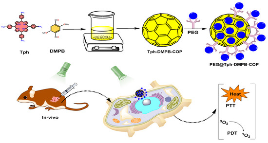 In recently reported work, nanoscale COFs (NCOF) can be employed as a dual modal (PDT/PTT treatment) platform when synthesized using a simple synthetic method in ambient circumstances. For example, stepwise BDF and guest encapsulation techniques were employed for the successful synthesis of VONc@COF-Por. In this report, PDT and PTT effects were seen separately in covalently grafted porphyrinic PS (Por) and noncovalently loaded naphthalocyanine PTA (VONc). It showed strong 1O2 production and a photothermal conversion capacity of 55.9% when exposed to visible light [10]. Furthermore, when imine-linked COFs were placed on the surface of Fe3O4 nanostructures for PTT, the findings indicated that Fe3O4@COF had a 21.5% photothermal conversion efficiency, which was similar to that of other well-studied photosensitizers, such as Au nanostructures [47]. Additionally, Tph–DMTP–COP nanoparticles were also produced at ambient temperature via a Schiff base condensation process. Under 650 nm laser irradiation, porphyrin functionalized COF produced an extended conjugated arrangement with strong π–π stacking interactions, leading to an outstanding photothermal effect with a 34.88% photothermal conversion efficiency. The synergistic effect of PDT and PTT both in vitro and in vivo resulted in an increased anticancer effectiveness. Because of its low toxicity, strong biocompatibility, great photodynamic effect as well as photothermal effect, and enhanced tumor suppression effectiveness, this porphyrin-based COP might be employed as both a photothermal agent and a photosensitizer in cancer phototherapy [48]. The complete schematic representation, from the synthesis to PDT and PTT applications, is given in Figure 10.