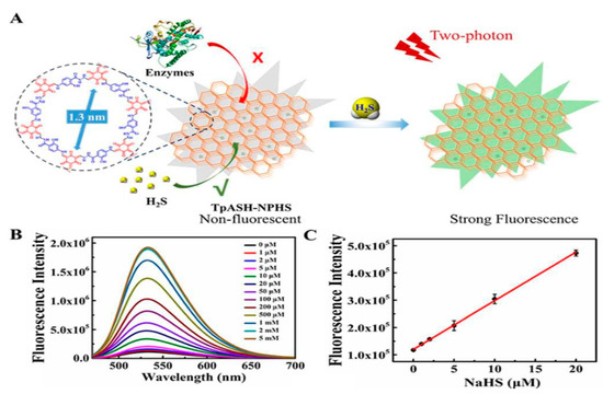 (A) H2S action on TpASH-NPHS; (B,C) fluorescence intensity at different concentrations and the correlation curve [50].