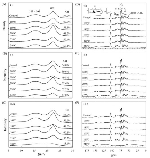 XRD (A–C) and NMR (D–F) spectra of luanta fir wood before and after VH treatment at different temperatures for (A,D) 4, (B,E) 8, and (C,F) 16 h.
