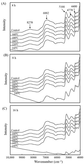 NIR spectra of luanta fir wood before and after VH treatment at different temperatures for (A) 4, (B) 8, and (C) 16 h.