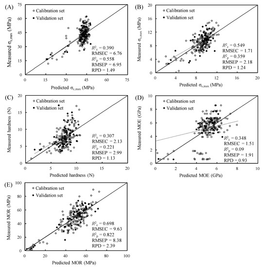 The predictive models of the mechanical properties of the study specimens were constructed according to these conditions. To test the accuracy of the predictive models, the prediction sets were input to the models to obtain the coefficient of determination for prediction (R2p), the RMSEP, and the RPD; the accuracy of the test results is depicted in Figure 5. The results indicated that when linear regression through the origin was performed for each characteristic, the MOR predictive model had the highest R2c value (0.698), whereas the hardness predictive model had the lowest (0.307); thus, the MOR model had the best modeling power. However, the σs,max, hardness, and MOE models had substantially decreased R2p compared with R2c, indicating poor predictive performance. Furthermore, the RMSEP of these models were greater than the RMSEC, indicating poor stability. Conversely, the MOR model had a greater R2p (0.822) than R2c (0.698), and its RMSEP (8.38) was significantly lower than its RMSEC (9.63), indicating favorable predictive power. Furthermore, RPD is the ratio of the SD of the measured values within the prediction set to the RMSEP; this value can be used to assess the accuracy of the model. Higher values indicate greater accuracy. If RPD = 1.0–2.5, the model can be used for wood grading [64,65,66]. Figure 5 reveals that the RPDs of the σc,max, σs,max, hardness, and MOR models were 1.49, 1.24, 1.13, and 2.39, i.e., all between 1.0 and 2.5; thus, these four models could be used for grading. The MOR model had an R2p of 0.822 and an RPD of 2.39, the highest among the models, and the regression lines of its predicted and measured values had slopes near 1, indicating that it had the best predictive power. By contrast, the MOE model had the lowest R2p value and RPD, i.e., 0.089 and 0.93, respectively; ergo, this model was not suitable for predictions [67,68].