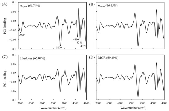 To further understand the main factors affecting the predictive models with RPDs of 1.0–2.5, the PC1 variable loading of the NIR predictive model was further examined. The analysis results are depicted in Figure 6. The main characteristic peaks in the graphs are the absorption peaks of hydroxyl groups in the cellulose amorphous region at wavenumber 7000 cm−1, of hydroxyl groups in water molecules at 5200 cm−1, of C–H vibrations in cellulose and hemicellulose at 4400 cm−1, of hemicellulose at 4286 cm−1, and of lignin at 4028 cm−1. These results indicate that changes in the hemicellulose content, in the hydroxyl groups in the cellulose amorphous region, in the moisture content of the wood, and in the relative lignin content are the main factors contributing to changes in the mechanical properties of VH-treated wood. Kobori et al. [69] also asserted that water and cellulose are the major factors of a wood properties prediction model.