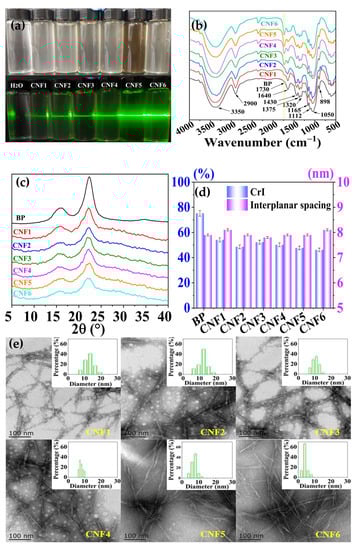 Structural characteristics of the CNFs. (a) Tyndall effect of CNFs; (b) FTIR spectra of BP and CNFs; (c) XRD diffraction of the BP and CNFs; (d) crystalline and interplanar spacing of the BP and CNFs; (e) TEM and the diameter distribution of the CNFs.
