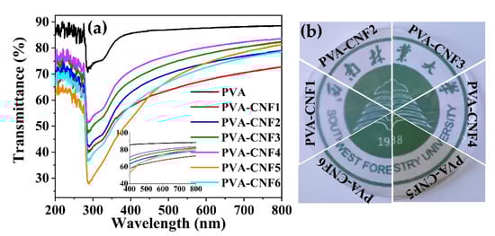 Dispersion of the nanofiber throughout the film may result in light scattering. The transmittance spectra of the pure PVA and CNF–PVA composite films are displayed in Figure 2. The peak at about 300 nm in Figure 2a might be ascribed to the n–π* transition of carboxyl groups [,], whose intensity increased with the carboxyl group content in CNFs. The pure PVA film had the most transparent 87.4%. Composites with CNFs decreased the transparency of the films due to the light scattering by CNF. Despite this decrease in transparency, the composite films were still clear enough to see through easily (Figure 2b). Compared with other CNFs, the CNF1–PVA composite film had high opacity. This phenomenon might be due to the fact that CNFs with high zeta potential corresponds to better stability and good dispersibility in PVA. The related homogeneous structure with transparency has also been found in nanocellulose–PVA composite films [,]. However, the UV-blocking properties of the CNF–PVA composite films was much lower than the citric acid–cysteine–PVA film. This might be due to the fact that citric acid and cysteine molecules crosslinked PVA chains through covalent bonds []. However, the CNFs were added as solid particles and dispersed in PVA, which can scatter the light.