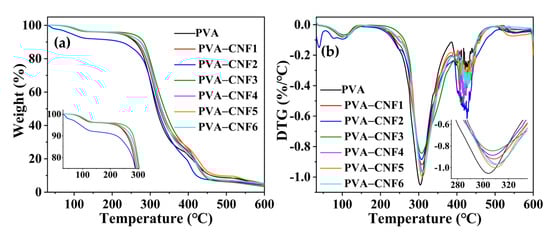 The effect of CNFs on the thermal stability of the PVA film is shown in Figure 3a,b. There were three stages in the DTG curves of films. An 8% weight loss at about 60–120 °C was ascribed to the evaporation of the absorbed moisture. The main weight loss of the samples was observed in the second stage in the range of 250–350 °C. This stage was attributed to the pyrolysis of the main composition of the films. Composites with CNFs led to a slight shift in temperature for the maximum decomposition rate from 304 °C to 312 °C. The shift might be due to the hydrogen bonding between CNF and PVA. The third stage (370–600 °C) was attributed to finial decomposition to ash as well as the decomposition of cellulose into D-glucopyranose monomers and then into free radicals []. Thus, films contained CNFs had a higher decomposition rate in this range compared to pure PVA due to the decomposition of cellulose.