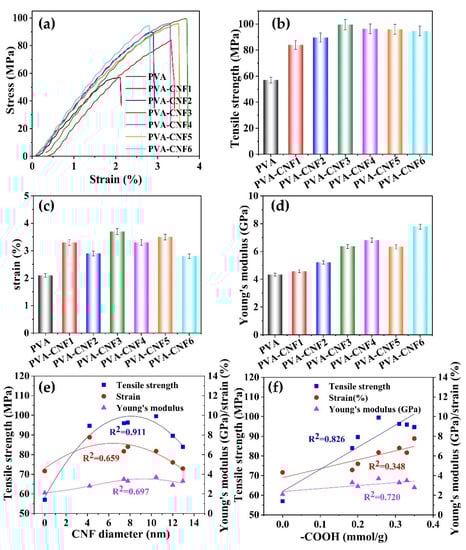 Mechanical properties of the pure PVA and composite films. (a) Stress; (b) tensile strength; (c) strain; (d) Young’s modulus; (e) relationship between the CNF diameter and mechanical properties of the composite films; (f) relationship between the carboxyl group content and mechanical properties of the composite films.