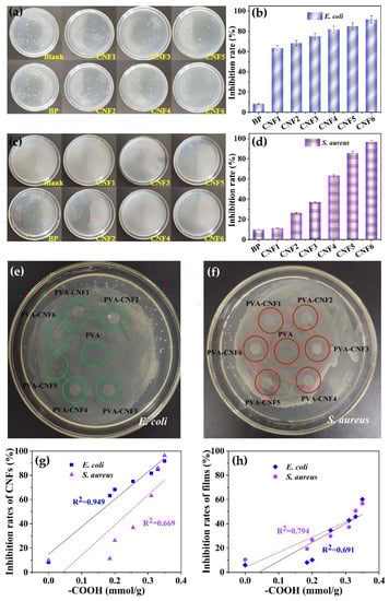 Inhibition of CNFs for E. coli (a,b) and S. aureus (c,d), inhibition of composite films for E. coli (e) and S. aureus (f), and the relationship between the carboxylic group content and the inhibition of CNF (g) and the composite films (h).