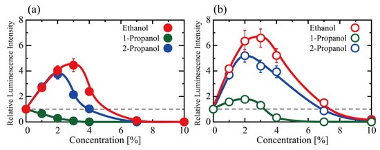 A cell-free in vitro luciferase assay was performed with a TnT (Rabbit Reticulocyte Lysate) T7 Quick Coupled Transcription/Translation System (Promega) according to the manufacturer’s instructions (www.promega.com/protocols/, accessed on 20 October 2022) and as previously described by our group [19,20,21,22]. Plasmid DNA (Luciferase T7 Control DNA, 4331 bp, Promega, Madison, WI, USA) encoding the firefly luciferase gene was used as the DNA template. The DNA concentration was 0.3 μM in nucleotide units. The reaction mixture containing the DNA template was incubated for 90 min at 30 ℃ on a Dry Thermo Unit (TAITEC, Saitama, Japan). The incubation time (90 min) was optimized so that the luminescence intensity was in the linear phase and had not yet reached the rate-slowing stage, as shown in Figure S1. We measured the change in the luminescence intensity when various concentrations of ethanol, 1-propanol, or 2-propanol were added to the reaction mixture. The expression of luciferase was evaluated after the addition of luciferin (luciferase substrate; Luciferase Assay Reagent, Promega) by detecting the emission intensity at 565 nm using a luminometer (MICROTEC Co., Chiba, Japan).
