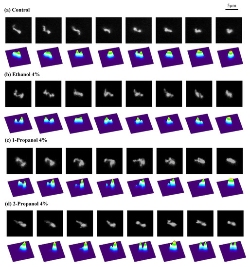Ethanol and 2-propanol exhibit germicidal effects against viruses, bacteria, and fungi, and are currently used as disinfectants. As for the biological effects of ethanol as a drink, excessive alcohol consumption leads to prevalent liver diseases, AUD (alcohol use disorder), and other various diseases [8]. Alcohol consumption, especially through adolescent binge drinking, causes epigenetic reprogramming on the synaptic activity response element [9]. Based on a recent statistical analysis of human participants (ca. 4.7·105), alcohol intake above threshold levels was shown to shorten the length of telomeres, which is a causal risk factor for several age-related diseases such Alzheimer’s disease [10]. Many studies have been performed to identify specific genes whose expression is modified after alcohol exposure in animals and cultured cells [11,12,13,14]. Genome-wide association studies (GWAS) reported that alcohol consumption caused both the down- and up-regulation of hundreds of genes in mouse experiments. Importantly, these studies showed that gene expression patterns correlated well between mice and humans. They also discussed the long-standing genomic effects (e.g., genetic and epigenetic modifications) caused by alcohol consumption. As far as we know, the current knowledge on the effects of relatively low concentrations of low molecular-weight alcohols on genetic activity is rather poor, despite their wide usage and application in biological sciences and also in daily life as mentioned above. Thus, in the present study, we carried out an experimental study to compare the effects of low concentrations of alcohols (i.e., ethanol, 1-propanol, and 2-propanol) on gene expression, in addition to the single molecular observation on the influence of different alcohols on the dynamic property of the higher-order structure of DNA through the analysis of intrachain Brownian motion.