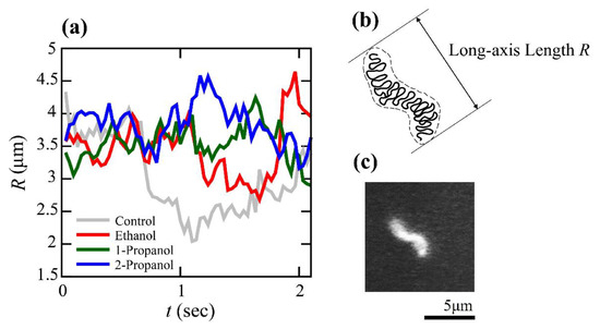 As indicated above, the efficiencies of transcription-translation (TX-TL) and translation (TL) were markedly changed at relatively low concentrations of alcohol. To clarify how alcohols caused these effects, we measured the conformational dynamics of individual T4 GT7 DNA molecules using fluorescence microscopy. Examples of time-dependent fluctuations in the DNA conformation are shown in Figure 2, where fluctuations of the DNA conformation were observable due to the relatively large size of the DNA molecule (166 kpb with a contour length of 57 µm). By calculating the intramolecular Brownian motion of individual DNA molecules, we noticed that the degree of fluctuation tended to be depressed with the addition of alcohols. In other words, DNA molecules appear more constrained with an increase in alcohol concentration. Therefore, we analyzed time-dependent fluctuations by measuring the long-axis length, R, by adapting the similar procedure of our previous report [18]. Based on the data of the time-dependent change of the long-axis length exemplified in Figure 3, we have evaluated the autocorrelation C(τ) of the long-axis length.