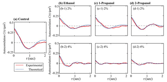 Autocorrelation of the time-dependent fluctuation of the long-axis length of single T4 GT7 DNA molecules (166 kbp). The curve was fitted based on Equation (2). (a) Fluctuations measured in the Tris-HCl buffer solution without alcohol (control), (b) with ethanol, (c) with 1-propanol, or (d) with 2-propanol.