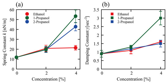 Figure 5 shows changes in the spring constant (k) and the damping constant (γ) at different alcohol concentrations as evaluated through the procedure explained above. Both k and γ values almost double at 2% alcohol, and the differences among the alcohols were not significant. At 4%, 1-propanol increased both k and γ. 4% 2-propanol also increased k, but not to the same level as 4% 1-propanol. In relation to the specific effect on the viscoelastic property induced by 1-propanol compared to ethanol and 2-propanol, 1-propanol caused greater effects in the TX-TL and TL reactions compared to ethanol and 2-propanol (see Figure 1).