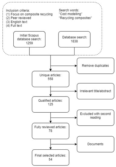 The results of cost estimation studies cannot easily be compared to each other since system boundaries, data type, and data sources, are different in each case. However, the available studies allow to see the overall picture and patterns and might be used for further assessments. The methodology adopted for this research study is a traditional narrative-based review of relevant literature in the field described by Mayer (2009) []. The main aim of this work is to review the cost modelling related works in terms of recycling composites as opposed to reviewing technical aspects of those techniques. The main database used for the search of literature was Scopus, which was supplemented by other databases such as the Web of Science, ScienceDirect, Research Gate, IEEE Xplore and Google Scholar. Articles published only in English were included in this review. The keywords for the search of relevant studies were “cost modelling”, “cost estimation”, “financial analysis”, combined with (using a Boolean operator “AND”) the recycling related part of the research with keywords such as “recycling composites”, “recycling fiber-reinforced composites”, “recovery of carbon fibers”, “recycling glass fibers”. As a result, the relevant research articles were chosen based on the analysis of the title, abstract, and results of the study. Figure 1 shows the steps of the literature review with the number of selected and excluded articles. The main part of the work, state-of-the-art, does not include research works which did not address both research areas, namely, cost modelling and recycling composites. However, a few studies with no direct relationship to composites were included which would potentially provide further guidance for the research. The review includes only recent studies published during the last 20 years, as the maturity of the recycling methods was not at an adequate level prior to this period. The number of studies that ties the concepts of cost estimation and recycling composites was found to be limited.