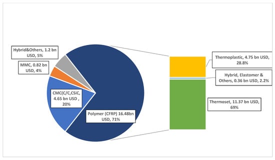 Based on the polymer type, fiber-reinforced composites are divided into thermosets and thermoplastics []. The fundamental difference between thermosets and thermoplastics is that the first type of material is cross-linked and cannot be remelted, while thermoplastics can be melted and reshaped []. Polymer-matrix composites cover the vast majority of the composites market, in which two-thirds correspond to thermoset composites, though the application of thermoplastics composites has increased significantly in recent years []. Another recent report by Sauer and Kühnel (2018) [] indicates that thermosets still correspond to 69% of all carbon fiber composites, as illustrated in Figure 2.
