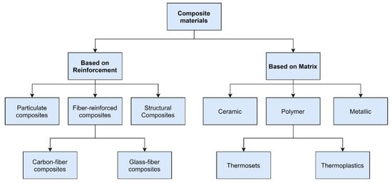 A composite material is a material produced by a combination combining two or more materials with significantly different physical properties, which allows obtaining desired unique properties. The combination of different materials allows to obtain new materials that are stronger, lighter, or less expensive, compared to conventional materials []. The composite material is generally a combination of the matrix and the reinforcement. According to the matrix type, the matrix materials are classified into metals, plastics, and ceramics []. Composite materials, in turn, can be classified by the types of reinforcement such as, for example, fiber-reinforced composites, particulate, and structural composites. The fibers can be classified according to their lay-up and length, such as continuous (aligned), long, or short [].
