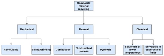 Remolding or remelting are used only for thermoplastic matrix composites because of their important characteristic of being able to be reshaped under high temperatures. The main challenge related to the thermoplastic composites is their viscosity at the melted state (500–1000 Pa·s), which is considerably higher than for thermosets (less than 100 Pa·s) []. The process requires high-pressure tooling for the impregnation of fibers and energy inputs for temperature control of this tooling, which makes the process rather expensive. Recycling methods for thermoplastic materials are studied more in terms of non-composite polymers rather than in the form of composites. The following methods will not include thermoplastic composites and focus on only thermosetting polymers [].
