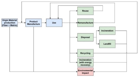The production of virgin fiber composites, products manufacturing including composites and disposal, requires the conversion of material and energy resources. These operations cause a negative environmental impact including the issues of energy consumption, air pollution, and waste management. The Life Cycle Assessment (LCA) framework has been developed to evaluate the energy consumption and environmental footprint of a product or a process. The methodology is validated and standardized by the International Organization for Standardization (ISO) in ISO 14040 and 14044 standards []. LCA focuses on the entire life cycle of a product or a process, starting from the raw materials and ending with the disposal stage. Numerous studies adopting the LCA approach were conducted to evaluate the recycling of composites in terms of energy and environmental impact and predicted a promising future throughout their life-cycle both during application and recycling [,,,].