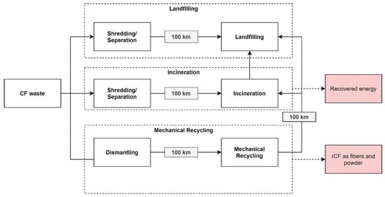 Li et al. (2016) [] developed both LCA and LCC models to assess the environmental and financial feasibility of the mechanical recycling process for carbon fiber composites. Additionally, incineration and landfilling pathways were included in the analysis to examine environmental and financial effects. The LCA included modules of different disposal options such as landfilling, incineration, and mechanical recycling. The used model representation is illustrated in Figure 6.