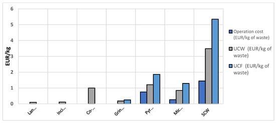 Vo Dong et al. (2018) [] conducted an economic and environmental assessment of disposal routes for CF waste. The developed model compared landfilling, incineration, mechanical recycling, pyrolysis, and chemical recycling (supercritical water (SCW)) methods in terms three economic indicators, namely: (1) operation cost per mass of unit waste; (2) the unit cost per mass of unit waste (UCW); and (3) the unit cost per mass of recovered fiber (UCF), as shown in Figure 7. Vo Dong et al. (2018) [] explained that co-incineration allows material recovery in addition to energy recovery. In co-incineration, waste is used as a substituted fuel involved in clinker fabrication where coal is normally used as a fuel and the products of waste combustion, i.e., heat and ash, are completely valorized in co-incineration. SCW is the recycling technique which focuses on the utilization of water, a cheap and low-hazardous risk raw material compared to organic solvents, but this technique requires a large amount of energy to operate at supercritical conditions [].