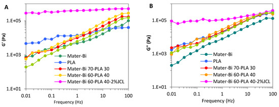The melt rheological behavior of the Mater-Bi/PLLA blends, as well as neat PLLA and Mater-Bi, were investigated by oscillatory sweep measurements of the storage modulus (G′), loss modulus (G′′), and complex viscosity (η*) as a function of frequency (f) in the linear domain (Figure 7) at 160 °C. The Mater-Bi exhibited the lowest melt viscosity at 160 °C with a shear-thinning behavior as the frequency increased, which is typical of viscous melt polymer. In comparison, PLLA demonstrated higher η* at 160 °C. The uncoupled blends follow a shear thinning [28] behavior intermediate between the neat PLA and Mater-Bi. Their viscoelastic character at melt is dominated by a liquid-like behavior with G″ being higher than G′ and the power-low frequency dependence (Figure 7A).