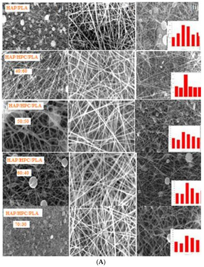 The HAP-HPC/PLA mat showed different diameter sizes for each composition ratio of HAP-HPC/PLA fabrication. The higher HAP-containing mat showed a smaller fiber diameter, while the mat with no HAP showed a higher fiber diameter. From Table 6, it was observed that the HAP-HPC/PLA nanofibrous mat of the composite ratio 70:30 showed a diameter of 110 ± 66 nm, whereas the mat of composite ratio 40:60 showed a fiber diameter of 277 ± 11 nm. Additionally, as stated earlier, the fiber diameter decreases with an increase in the concentration of HAP. The viscoelastic property may be the cause for the reduction in diameter size with an increase in HAP concentration since all parameters remained constant.