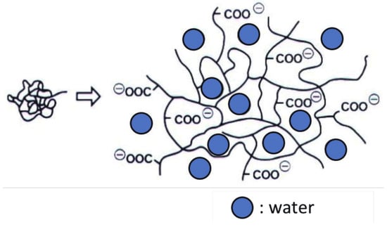 Figure 2. Water absorbing mechanism of superabsorbent polymer. - Suspension polymerization or inverse-suspension polymerization: The advantage of this method is that the products are obtained as powder or microspheres (beads). Thus, grinding is not required. The monomers and initiators are disseminated as a homogeneous mixture in the hydrocarbon phase using this approach. The size and form of the resin particles influence the viscosity of the monomer solution, rotor design, agitation speed, and dispersant type. The dispersion is thermodynamically unstable and needs both constant agitation and the addition of a suspending agent with a low hydrophilic-lipophilic balance (HLB).