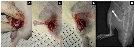 Rodent PJI model for testing antimicrobial efficacy of MLTRPB coating. (A) femoral condyle is exposed after approach to the knee joint, (B) intramedullary identification is made with 18 g needle, (C) insertion of the coated screw, and (D) postoperative x-ray showing adequacy of implant insertion.