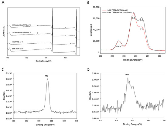 XPS survey spectra of (A) 1-MLTRPB on titanium implant: multi XPS data, (B) 2- MLTRPB on titanium implant: 1-MLTRPB(DEGMA rich) and 2-MLTRPB(HEMA contained), (C) LVF loaded 3-MLTRPB: LVF loaded 3-MLTRPB(DEGMA rich), and (D) GM loaded 4-MLTRPB (GM loaded 4-MLTRPB(HEMA contained)).