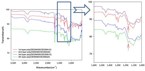 As shown in the FT-IR spectra (Figure 3), the O-H bending vibration at 1170 cm−1 belongs to the hydroxy of HEMA-contained MLTRPB-layered Ti implant surface. This is consistent with the XPS data, and it was confirmed that the expected polymer brush was polymerized in each layer.