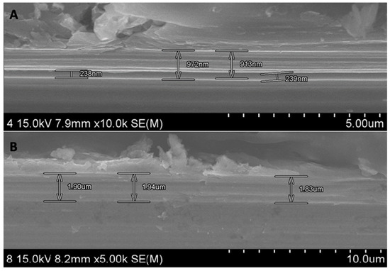 Thickness of MLTRP on Ti measured through FE-SEM. (A) 2-MLTRPB-Ti implant and (B) 3-MLTRPB-Ti implant.