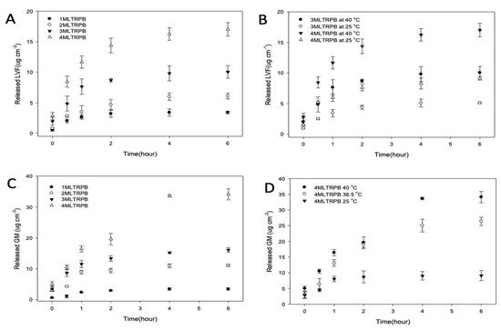 (A) LVF released into Milli-Q water from MLTRPB on Ti implants at 40 °C, (B) LVF released from 3- and 4-MLTRPB at different temperatures, (C) GM released into PBS buffer-D2 (pH 7.0) at 40 °C, and (D) GM released from 4-MLTRPB at different temperatures.