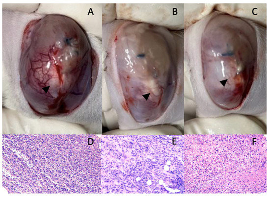 Representative gross image of the infected knee and corresponding histology from pericapsular tissue in non-coated (A,D), 1-MlTRPB (B,E), and 4-MLTRPB (C,F). Abundant pus formations (arrowheads) with prominent inflammatory cells were presented regardless of coating layers.